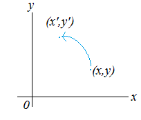 写像のうち特に元の集合と対応させる集合とが同一であるものを変換という.(ある集合Aから集合A自身への写像) ここでは,さらに限定して変換のうちで対応の規則が「定数項のない1次式」で表される1次変換を扱う. 右の例(5)で,1次変換はxy平面上の点の移動を表している. ![]() ![]() |