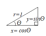 左図の直角三角形において x/r=cosΘ → x=cosΘ y/r=sinΘ → y=sinΘ となることに注意すると 下の図で(1,0)は(cosΘ,sinΘ)に移されることが分かる. (0,1)の行先はx座標が負になることに注意すると(−sinΘ,cosΘ)