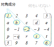 正方形の対角線は2本あるが,行列について「対角成分」というときは右下がりの対角線上にある成分をいう.(行番号と列番号が等しいもの)