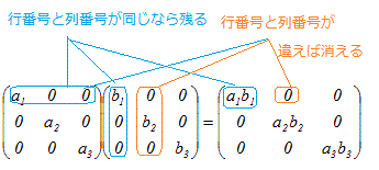 対角行列の積については「i≠j ⇒ (i , j)成分は0」「i=j ⇒ (i , i)成分は対角成分の積」となるから