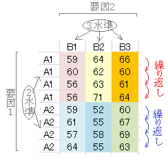 何分間煮るかという第1の要因については,10分間(A1)及び15分間(A2)の2つの条件があり,水準は2つあるという. 何度で煮るかという第2の要因については,80度(B1),90度(B2),100度(B3)という3つの条件があり,水準は3つあるという. この場合,煮る時間(第1の要因とその水準),煮る温度(第2の要因とその水準)を独立変数[説明変数]として審査員の評価という得点を従属変数[目的変数]と考えることになる. ※各要因の水準は,上の例のような数値的なものばかりでなく,「2種類の肥料,3種類の苗の組合せについて収穫量を調べる場合」「英数国の教科と指導方法の組合せについて試験の得点を調べる場合」「パンフレットの内容と配布方法の組合せについて商品の売れ行きを調べる場合」のように名義的な分類であってもよい. ○ 二元配置,多元配置
