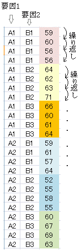 図1 【Excelの分析ツールを使って,繰り返しのある対応のない二元配置の分散分析を行うためのデータの形】