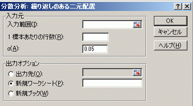 ※要因1の2つの水準名(A1,A2)はそのうちの先頭のセルだけが重要で他はなくてもよい(もし,A1という名前がデータの上から2つ目以下のセルだけに書かれていれば,結果の出力においてその名前は表示されない.).A1,A2の名前各4個をセルの書式設定によりセルを結合させて1つに表示しても構わないが,そのようにする必要はない.(他のソフトに移し替えることも想定するとセルの結合のようなExcel上だけで行われる表示上の細工はしない方がよい.) ※図1のデータがワークシート左上端にあるとき(セル番地のA1からD9の範囲.ラベルとの関係が紛らわしいが,要因1の2つの水準ラベルはA列に要因2の3つの水準ラベルは1行目にあるものとする),分析ツールを使って,繰り返しのある二元配置のダイアログボックスに入力するには,図2のダイアログボックスにおいて「入力範囲」にA1:D9を指定する.(要因1,要因2の水準名も入力範囲に含めるようにする.) 「1標本あたりの行数」に4と書きこむ・・・標本という言葉が1組の標本(集合)を表しているので1標本には4個のデータがある.(繰り返しの数がこの行数になっている.書物によっては,例数が4とも書かれるもの.)繰り返しは列方向に(行番号が増える方向に)セルが並んでいなければならない. ※分析ツールで繰り返しのある二元配置分散分析を行うときは,繰り返しの数が等しくなければならない.欠損データのあるとき(上で述べたアンバランスデザイン)は分析ツールでは調べられない. ○ Rコマンダーを使って対応のない繰り返しのある二元配置分散分析を行うときのデータの形