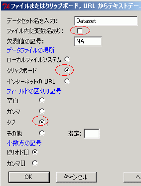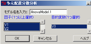 次に,このデータをクリップボードからインポートするには,図4のように「ファイル内に変数名あり」のチェックをはずしておかなければならない.(図3の形のデータの中には変数名はなく,Rコマンダーにインポートされるときに付けられる.) 最後に,Rコマンダーのメニューから[統計量]→[平均]→[多元配置分散分析]と進むときに,「因子(1つ以上選択)」のところをRコマンダーが付けた変数名V1,V2の2つとも選び,「目的変数(1つ選択)」を選択する.