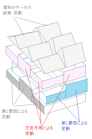 次に,3つの分散比を求める.+(要因2による変動) +(交互作用による変動) +(個別のデータによる誤差)