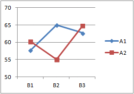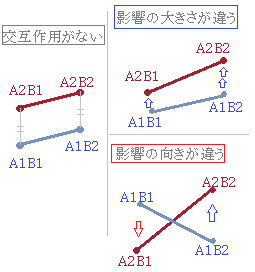 交互作用が有意でなければ,各要因が有意かどうか調べればよいが,交互作用が有意の場合は水準別の各要因の効果(=単純主効果)を吟味する.・主効果または単純主効果において有意差のあった要因が3水準以上ある場合には,多重比較を行う. そのために,まず各水準別の平均を計算し,右図11のような折れ線グラフを描くことから始める.右図12のように,交互作用がないときは,折れ線グラフが平行線になるが,1つの要因が他の要因に及ぼす影響が増減の「大きさ」や「向き」に現れるときは交互作用がある.図11は,B2のところで影響の向きが変化する例となっている. ここで示した例では,第1要因は2水準であるが,第2要因は3水準となっているので,交互作用またが第2要因について有意差があればさらに多重比較を行うことになる. |
