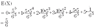 そこで,「さいころを5回投げたとき1の目が出る回数 X を確率変数とするとき, X の確率分布」は次のようになる. ![]() X の期待値は, ![]() 分散は,E(X2) - E(X)2 ![]() |