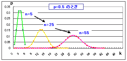 | 【なぜ二項というか?】 この確率分布関数 nCk pkqn-k が二項の和のn乗 (p + q)n の展開式となっているからである. |