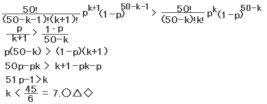 p=1/6 として 50Ck+1pk+1(1-p)50-k-1 > 50Ckpk(1-p)50-k となるkの範囲を求めると, ![]() これより,・・・<5<6<7<8>9>10>・・・が分かる. →閉じる← |
