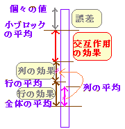 に分けて考える.ここで, (列の効果)=(列の平均)-(全体の平均) (行の効果)=(行の平均)-(全体の平均) (交互作用の効果)=(小ブロックの平均)-(全体平均)-(列の効果)-(行の効果) (誤差)=(個々の値)-(全体の平均)-(列の効果)-(行の効果)-(交互作用の効果) で定義する. 次に, 行の分散比=行の不偏分散/誤差の不偏分散 列の分散比=列の不偏分散/誤差の不偏分散 交互作用の分散比=交互作用の不偏分散/誤差の不偏分散 により,行,列,交互作用の平均値に有意差があるかどうか判断する. |