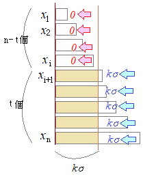 標準偏差(分散)の計算において,小さい方のn−t個の(xi−m)2を0に書き換え,大きい方のt個の(xi−m)2を(kσ)2に書き換えると,和は小さく(≦)なるから |- - 初めのn−t個 - -|| - - - 後のt個 - - - | |- n−t個 -||- - t個 - -| いま,確率P(|X−m|>kσ)は,