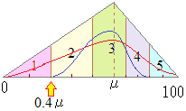 平均点を基にした相対的絶対評価を図で示すと,右図のようになる.(このようなグラフは,どこにも書いてない・・・いわゆる換算表というものを,筆者が見やすい形に直したもの.)これに当てはめて,クラス平均の40%もしくは半分以下の者を成績不振による単位不認定とする.(正規分布を前提とする相対評価との端的な違いは,評価1とか5の人数比は固定されておらず,標準偏差が小さい場合,単位不認定となる評価1はめったに生じない(青い曲線の場合).逆に,標準偏差の大きなクラス[できる者とできない者が一緒に学んでいるクラス]では,評価1,5が出やすい(赤い曲線の場合)) ところで,比例尺度でない試験の得点に対して,平均値の半分というような基準は意味を持たないはずであるから,戦後約60年間行われて来た高校の単位認定基準の原理的な根拠は,本当に大丈夫だったのか?理論的には相対評価と絶対評価の折衷主義であるが,経験的には抜群の安定感がある経験則として使われており,得点は比例尺度として和差積商の変換が当然のように行える.零点には絶対的な意味があり,教えられた内容のうちで習得できたものが0%だったという意味になる.