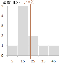 あるデータがどのような分布になるかは,度数分布表によって視覚的に分かることが多い.例えば,中心部の位置,散らばり具合,左右の片寄りなど,度数分布表によって分かることは多い.歪度は左右対称性を数値化したものです.歪度が0に近い分布は,左右対称であると言えます. • |歪度|<0.5のときは,ほぼ対称です. • 0.5≦|歪度|<1のときは,少し • |歪度|≧1のときは,かなり しかし,例えば誤差を除けば正規分布と見なせるかどうか,指数分布,一様分布など他の分布に由来するものでないかどうかは,歪度の数値を使った検定によって判断することができる. 歪度,尖度もしくはそれら両方を使って正規性の検定を行う方法が考えられている.次のような限界の値を見て,歪度|b1|の値からその分布が正規分布と見なせせるかどうかを判断します.(この表よりも大きければ正規分布でないとする) 5%:u=1.96, 1%:u=2.58