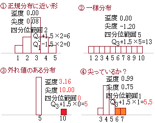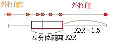 (その1)外れ値の存在は,度数分布表を見れば見当がつきますが,ではどの程度外れていれば「外れ値」と見なすのかということについて,よく使われる1つの目安として,箱ひげ図で 第3四分位数+1.5×四分位範囲より大きい値 第1四分位数−1.5×四分位範囲より小さい値 は外れ値と判断する. (その2) 尖度が5以上ならば外れ値が含まれる可能性が高い,尖度が10以上ならばほ確実に外れ値があると判断する. ![]() -- 図3 -- |