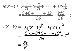 【 簡単な例 】 【例1】 2つの変数の組合わせごとに確率を考える(同時確率分布,結合確率分布)よりも,変数ごとに分けて考える方が簡単になる. 2個のさいころを同時に投げたとき出る目の和の期待値,分散を求めたいとき 計算1のように直接求めれば, ![]() のような複雑な計算になるが, 計算2から ![]() を組み合わせると ![]() のように,より簡単な計算で求まる. |