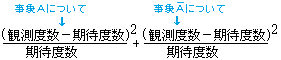 ※ 2×2の分割表では,期待度数のうち幾つかが4以下であっても分類の項目を併合すると意味がなくなる.この場合,標本の個数(観測度数)を大きくすることができなければ,「イエーツ(イエツ)の(連続)補正」呼ばれる方法(小さい方の期待度数に0.5を加える方法)がとられることがある.(離散分布を連続分布で近似するときに,真の値の限界を2つの整数の中央とするのと同様の考え方で,この方が経験的にも有効であるとされている.なお,列小計,行小計は変えない. ![]()