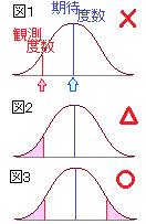 (4) 右図1のように,連続分布となっている確率分布関数において,ある特定の値をとる確率というものは考えない(線の面積は0).したがって,期待度数と比較して観測度数がズレているときに,「そんなにズレることは,偶然的に起こり得るのか」という疑問に答えるときに,右図1のようにちょうどその値になる確率を求めているのではなく,図2のように「その値以上ズレることが,偶然的に起こり得るのか」どうかを計算することになる. |
