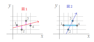 =>[作者]:連絡ありがとう.興味を持っていただいたということはありがたいことですが,質問内容をもっと絞ってください.すなわち,質的に異なる内容が1つの質問として尋ねられていますので,整合的な回答を示すことができません. (1) データが「点群」の場合は・・・通常の統計データは点群だと思いますので,この用語は何も限定しておらず,特に何も語っていません. (2) 一直線上にあるはずのものが千鳥足になっている場合・・・通常の統計データは,千鳥足になっています.はじめから同一直線上にあれば,回帰直線は不要で数学で解けます. (3) 座標系が任意であっても同一の直線が得られるか・・・「一般に,xからyを予測する式を裏返してもyからxを予測する式にはならない.」と文章で示してあります. 文章で回答すると以上のような味もそっけもないものになりますが,左図において図1の赤線はxからyを予測する直線で,図2の青線はyからxを予測する直線です.通常の場合これらは一致しません. |