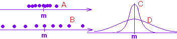 * 次の例において平均値との隔たり xk-m の平均を考えても,正負で打ち消し合って = 0 となり,使えない. ![]() また,平均値との隔たりの絶対値 |xk-m| の平均(平均偏差)が考えられるが,絶対値記号の付いた式は変形しにくく,使いづらいものとなる. そこで,平均値との隔たりの2乗の平均を考え,これを分散という. 分散は元の変数の2乗を使っているので,元の変数が cm のとき,分散の単位は cm2 となり,単位が合わないので,そのルートをとった標準偏差がよく用いられる. |