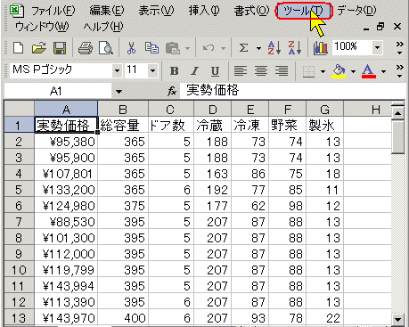 ■Excelの分析ツールの使い方■ 次の例では,冷蔵庫の「実勢価格」(目的変数)を「総容量L」「ドア数(個)」「冷蔵室L」「冷凍室L」「野菜室L」「製氷室L」(説明変数)で表わす重回帰式を求めることを当面の目標とする. 次の図のように目的変数(被説明変数,従属変数)がA列にあり,説明変数(独立変数)がB〜G列に入力されている場合を例に解説する. 操作方法は、下の[前の操作][次の操作]ボタンを順次押せば表示される.(データの出所:2007.3.18に価格.com>スペック検索>冷蔵庫で「冷蔵室」「冷凍室」「野菜室」「独立製氷室」「ノンフロン冷蔵室」を指定して表示されたもの.) |