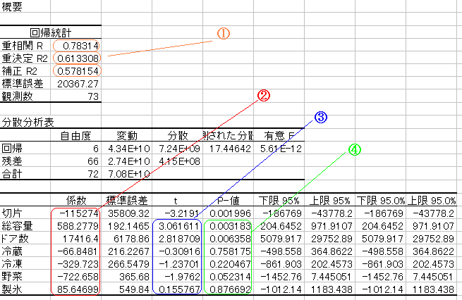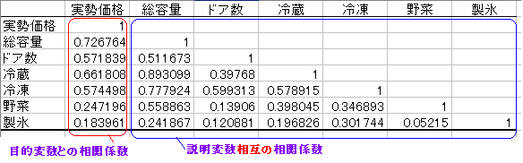 図1 ○ 重相関R・・・重相関係数.1に近いほどよく近似されたモデルとなる. ○ 重決定R2・・・決定係数.目的変数のばらつきの内,これらの説明変数で説明できる割合.Rの2乗に等しい. ○ 補正R2・・・自由度修正済決定係数.データ数が少ないと決定係数が自由度の影響を受けて実際よりも大きくなるので,自由度を考慮して補正した決定係数.この値が0.5以下では半分以下の説明しかできていないことになる.この値が1に近いほどよいモデル.←主にこれを見る. (2) ○ 係数・・・重回帰式の係数.上の図の場合,重回帰式は (実勢価格)= -115274+ 588.2779×(総容量)+ 17416.4×(ドア数) -66.8481×(冷蔵) -329.723×(冷凍) -722.658×(野菜) + 85.64699×(製氷)(3) ○ t・・・t値.| t | が大きいほど影響が大きい.(切片以外) (元のデータが標準化されていれば:[(観測値-それぞれの平均値)/標準偏差]回帰係数が影響度を表わすが,その変形は少し時間がかかる.データが生のままのときは | t値 |で分かる.) ○ P-値・・・P値が小さいほどその説明変数を用いたときの危険率が小さい.(切片以外) ■分析ツール>相関で出力される表■・・・ツール→分析ツール→相関 でデータ全体を選び「先頭行をラベルとして使用」にチェックを入れて出力されるもの ![]() ○ 説明変数相互の相関係数が高いものは,多重共線性(マルチコリニアリティ)の可能性あり要注意(悪い材料) |