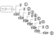• nに正の整数を代入して調べるものとする. • この例では,10以下の整数は,3までの素因数で割り切れなければ素数(または1)であると言える. • 7は素数になる. • else ifで連結した場合分けは「排反」になっていて,2つ以上の条件に合致するかどうかをテストできないので,例えばn=6のときは"2で割り切れる"と表示されて,3で割り切れるかどうか調べずに終わる.上記の分け方では,前の段階で合致すれば,後の段階のテストはしていない. • elseが付いている以上,「重複なく」分類され,最後のelseで「もれなく」分類される.要するに,この形に書けば,どれか1つだけに当てはまるようになる. • Visual BasicやPythonのようにelseifとかelifという1つの制御文があるわけではなく,C言語やJavascriftと同様にelseの影響下にifが書かれているいるので,次のように記述すれば,論理的に同じプログラムになる.しかし,何と言っても【例2.3.1】の書き方が単純明快で,点検もしやすいと言える.