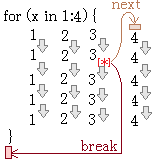 すなわち,breakの場合はループを抜け出るのに対して,nextの場合はループ変数xの次の値の先頭に進む. |