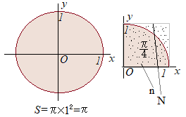 原点を中心とする半径1の円の面積は,πであるから,その内の第1象限(x>0, y>0)にある部分の面積はそこで,0≦x≦1, 0≦y≦1の範囲で点(x, y)をランダムに発生させた場合,点(x, y)が円 これを利用して,解析(計算)や幾何(図形)の結果を使わずに,確率を使って円周率πを求める方法は「モンテカルロ法」と呼ばれる.(モンテカルロはモナコの地区の名前.国営のカジノがある) 次の例2.7.1では,モンテカルロ法を用いて,円周率を求め,誤差が0.0000001=10−7以下になったら,breakで抜け出す. モンテカルロ法は,解析や幾何の定理を使わなくても円周率が計算できるというところに大きな意義があり,実際の計算の精度(収束の速さ)は速くない.実測では,PCが32ビット機の場合,誤差を0.0000000001=10−10以下とすると,なかなか収束せずに無限循環"風"になってしまって,終われないことがある(64ビット機の場合は,もう少し高い精度まで行けるかも?)