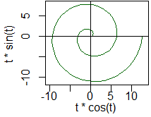 plot(t*cos(t),t*sin(t),type="l",asp=1,col="darkgreen")