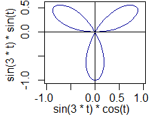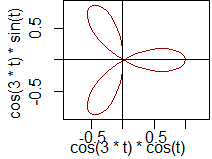 3枚葉の正葉曲線を極座標で書くと:これを ここでは,a=1の場合について,Rのplot(x,y,type="l")を使って表すと t<-seq(0, 2*pi,length=101) plot(cos(3*t)*cos(t), cos(3*t)*sin(t), ![]() --図18-- で定まる正葉曲線も3枚葉であるが,下の図のように縦と横を入れ替えたものになる. ![]() --図19-- |