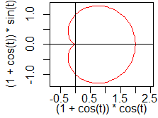 カージオイド(心臓型)を極座標で書くと:これを ここでは,a=1の場合について,Rのplot(x,y,type="l")を使って表すと |