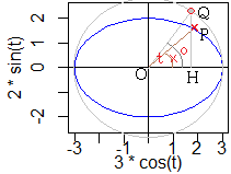 楕円の方程式ここでは,a=3, b=2の場合について,Rのplot(x,y,type="l")を使って表すと t<-seq(0, 2*pi,length=101) plot(3*cos(t), 2*sin(t), type="l", asp=1,col="blue") abline(h=0) abline(v=0) ![]() --図13-- • OQ=3 ⇒ OH=3cos t, PH=QH×2/3 =3sin t×2/3=2sin t |