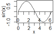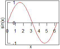省略時 ⇒ 軸と平行な向き las=0 ⇒ 軸と平行な向き las=1 ⇒ 画面に対して頭が上向き las=2 ⇒ 軸と垂直な向き las=3 ⇒ 画面に対して頭が左向き ここまでの内容を踏まえて,とりあえずの完成形を作ると次の式とグラフになる. 【完成形】 curve(sin(x),0,2*pi, xaxt="n", yaxt="n",col="red") axis(side=1, at=0:7, pos=0) axis(4, at=-1:1, pos=0,las=1) ![]() --図10-- |