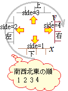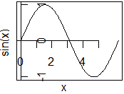 【例】 curve(sin(x),0,2*pi, xaxt="n", yaxt="n") axis(side=1, at=-1:5, pos=0) axis(4, at=-2:2, pos=0) ![]() --図8-- ![]() --図9-- • 第1引数として書けば,side=は省略できる.(上記のようにside=1と書いてもよく,第1引数に4 と書いてもよい) • sideは右図のように決まるので,通常は1としてx軸を,4としてy軸を表示するとよい. • y軸のat=−2:2のように,min=−2から,max=2までを(at which)指定しても,実際のグラフが−1から1までしかないときは,−1から1までが表示される. • x軸のat=−1:5のように指定して,実際のグラフが0から2π≒6.28までのとき,実際のグラフがある範囲0から2π≒6.28が表示され,目盛りは指定した範囲だけ(5まで)になる. |