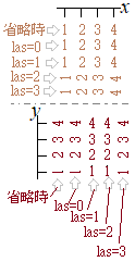 により,どの向きの(side)座標軸を,どの目盛り(min)から,どの目盛(max)まで(at which)表示するかを指定する.pos=は,その座標軸が交差する相手方の軸の座標