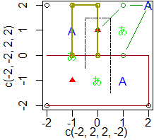 points(c(2,1,-1),c(2,-1,1),pch="A", col="blue")・・・B