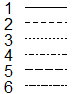 lty=0またはlty="blank"⇒無しlty=1またはlty="solid"⇒実線 lty=2またはlty="dashed"⇒ダッシュ lty=3またはlty="dotted"⇒鎖線 lty=4またはlty="dotdash"⇒1点鎖線 lty=5またはlty="longdash"⇒跳び破線 lty=6またはlty="twodash"⇒長短の鎖線(1点鎖線で詰まり気味=4よりも空白が短いもの) ※lty=7以上はlty=1からの繰り返し(lty=0は再登場しない) FGlwdは線幅line widthで,省略すれば1(最も細い線)になる. ※正の整数値で指定するのが基本だと考えられるが,小数や分数でも可能.実験的には,小数点以下を切り捨てた整数と一致する(ただし0〜1までは1になる) |