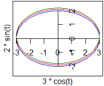 は同じ働きをする・・・polygon()・・・Cはlines()の最後に中塗り作業が入るだけなので,ここでは扱わない.points(x, y, type="l")・・・A lines(x, y, type="l")・・・B 【例3.1】楕円を描く t<-seq(0, 2*pi,length=101) #・・・(*) plot(3*cos(t), 2*sin(t), type="l", ![]() --図20-- @高水準作図関数point()により−3≦x≦3, −2≦y≦2の範囲に青色で楕円を描く. xaxt="n", yaxt="n"により外枠の目盛りを書かない. Apoints()により同じ楕円を赤色で描く(完全に重なると前の図形が見えなくなるので,y座標に+0.1のズレを追加する) Blines()により同じ楕円を暗緑色で描く(完全に重なると前の図形が見えなくなるので,y座標に+0.2のズレを追加する) (4)座標軸を描く |