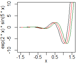 【例3.2】指数関数×三角関数 t<-seq(-pi/2, pi/2,length=101) #・・・(*) curve(exp(2*x)*sin(5*x), -pi/2, pi/2, ![]() --図21-- @高水準作図関数curve()により 外枠の目盛りは書く Apoints()により同じ図形を赤色で描く(完全に重なると前の図形が見えなくなるので,x座標に+0.1のズレを追加する) Blines()により同じ図形を暗緑色で描く(完全に重なると前の図形が見えなくなるので,x座標に+0.2のズレを追加する) |