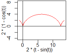 plot(2*(t-sin(t)),2*(1-cos(t)),type="l",asp=1,col="red")