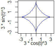 アステロイド(星芒形)ここでは,a=3の場合について,Rのplot(x,y,type="l")を使って表すと t<-seq(0, 2*pi,length=101) plot(3*cos(t)^3,3*sin(t)^3,type="l",asp=1,col="blue") abline(h=0) abline(v=0) ![]() --図16-- • 媒介変数表示直した場合は において,m=1のときが円.1<mのときは,座標軸に近づいて,凹形になる |