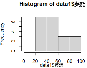 とする.hist(data2$英語, breaks=seq(0,100,20))の場合