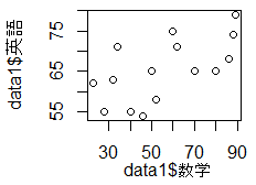 yベクトル:data1$英語 → 順にy座標を表す pch=16 : マーカーとして●を使用する col="blue" : マーカーは青色にする cex=0.5 : character expansionにより,標準の文字サイズ(1)との比率を指定する. |