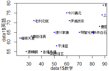 text(data0$数学+0.7,data0$英語,data0$氏名,adj=0,cex=0.7)
