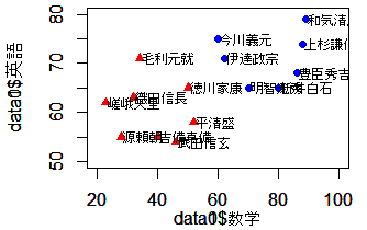 図3のように,1組の生徒(和気清麻呂〜今川義元)を青●のマーカーで,2組の生徒(毛利元就〜徳川家康)を赤▲のマーカーで区別して散布図に示す方法を考える.ここでは,関数par()を使ってグラフィック画面に上書きしていく方法を紹介する.