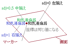 • text()の引数に adj=0とすると,その座標に対して左揃えで文字列が表示され,adj=1とすると右揃えで表示される.adj=0.5のときは中揃えであるが,上図の緑で示した位置よりも実際には下になり,マーカーと重なる. • adj=0の左揃えでもマーカーと文字列が重なるので,少しだけ空白を入れるために,この例では,text()の座標をdata0$数学+0.7,data0$英語とした.(文字サイズとの関係で,表示した上で微調整するとよい) • 文字列のサイズはcex(character expansion:文字拡大率)=で指定する.cex=1が標準サイズで2は2倍,0.5なら半分の大きさになる.散布図のラベルも「大き過ぎるとそれなりに邪魔」になるので,比率を変えて見やすいサイズにするとよい. |