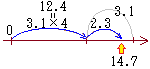 14.7 %/% 3.1 → 4 … これは,floor(14.7/3.1)に等しい14.7 %% 3.1 → 2.3 となる.⇔ 14.7 = 3.1×4+2.3