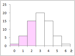 k≦2(10円硬貨を6回投げて,表が2回以下)となる確率は, 次のグラフで桃色の部分の面積は,約34% ○ サイコロを6回投げて,表の出る回数が2回以下となるのは,珍しいことではない.(0.3437 > 0.05)