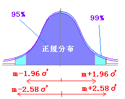 ※ よく使われる信頼度は95%,99%の2つ (100%の信頼度にすると,区間が-∞〜∞となって意味がなくなる.) ![]() P(m-2.58σ’≦μ≦m+2.58σ’) = 0.99 σ’= [高校数学C] 母標準偏差σが分からないとき,σの代わりに標本の標準偏差 s を用いてよい. [理系の専門学科・高卒以後] 母標準偏差σが分からないとき,母集団の標準偏差の推定値として,標本の不偏偏差を用いる.(不偏偏差の方が少し大きい.) |