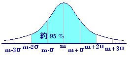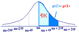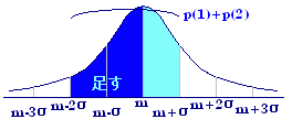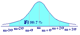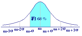 ※ 正規分布表の値を覚える必要はないが,よく使う値の範囲について確率の「目安」は分かる方がよい. P(m ≦ X ≦ m + σ ) = P( 0 ≦ Z ≦ 1 ) = p(1) = 0.3413 だからP(m - σ ≦ X ≦ m + σ ) = 0.6826 ( 68.3%) ![]() ![]() ![]() |
